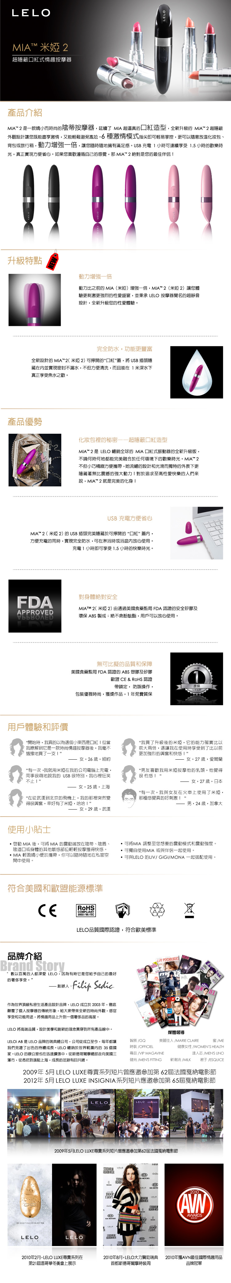 MIA™ 2(米婭2)是LELO特色的USB充電口紅式按摩器MIA(米婭)的全新驚喜升級版。目前MIA2在實現完全防水的同時,振動動力更增強一倍,6種激情 模式盡在掌握之中。通過USB充滿一次電即可帶來1.5小時的連續振動,光滑無痕的外觀設計更是確保她總能在瞬間回應您的激情。