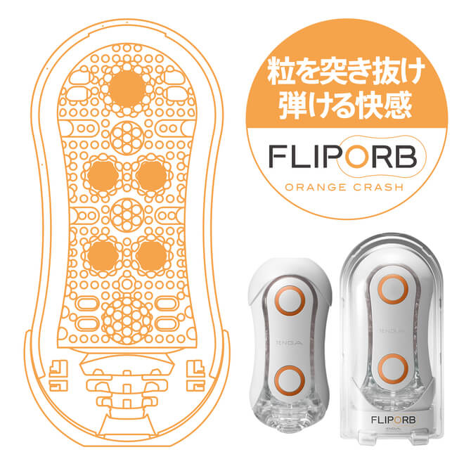 Tenga - Flip ORB ORANGE CRASH 飛機杯,可以算是FLIP 0 的小型版。外形的全新設計,把中間收窄,更符合人體工學,握感更佳! 重量減低至500克,長期使用也不會易感疲累。內部佈置了數顆中型的圓球,配合上極多觸鬚裝的軟身紋路,使你感到非常酥麻,只要你用力一按,更能感受強烈的圓球衝擊效果,非常刺激!!