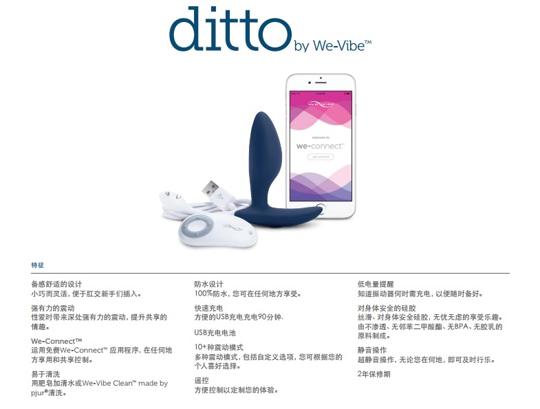 With the free We-Connect™ app you can play and share control of Ditto from anywhere, create custom vibes and play together with other We-Vibe® products.