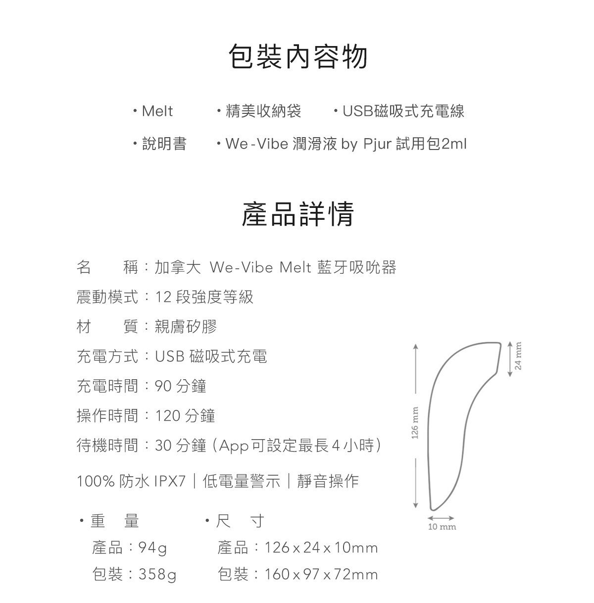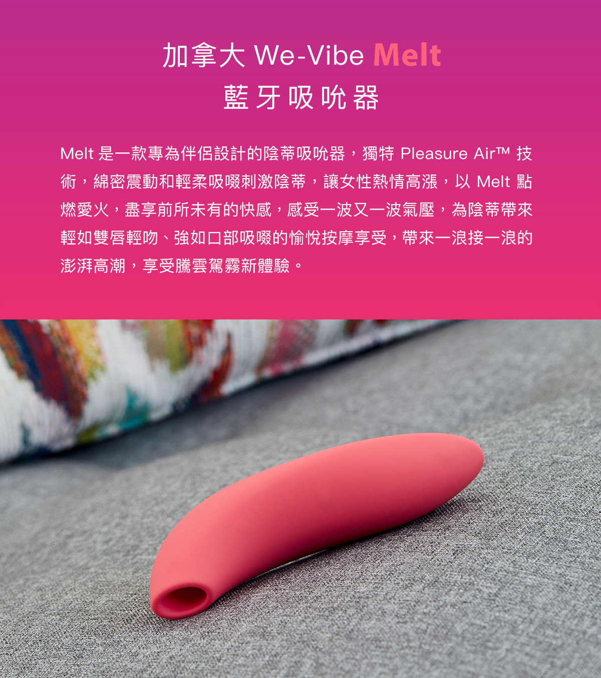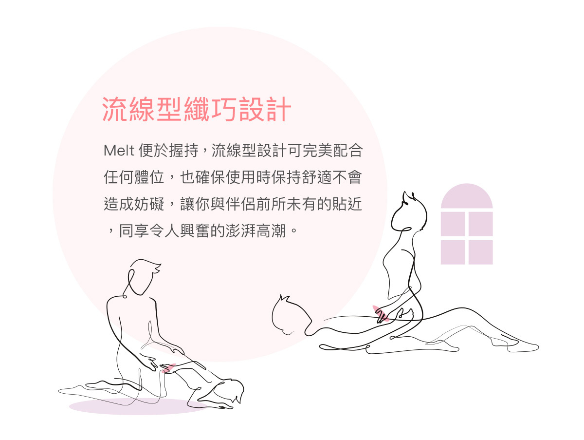 Melt 是一款專為伴侶設計的陰蒂吸吮器,獨特 Pleasure Air™ 技術,綿密震動和輕柔吸啜刺激陰蒂,讓女性熱情高漲,以 Melt 點燃愛火,盡享前所未有的快感,感受一波又一波氣壓,為陰蒂帶來輕如雙唇輕吻、強如口部吸啜的愉悅按摩享受,帶來一浪接一浪的澎湃高潮,享受騰雲駕霧新體驗。
